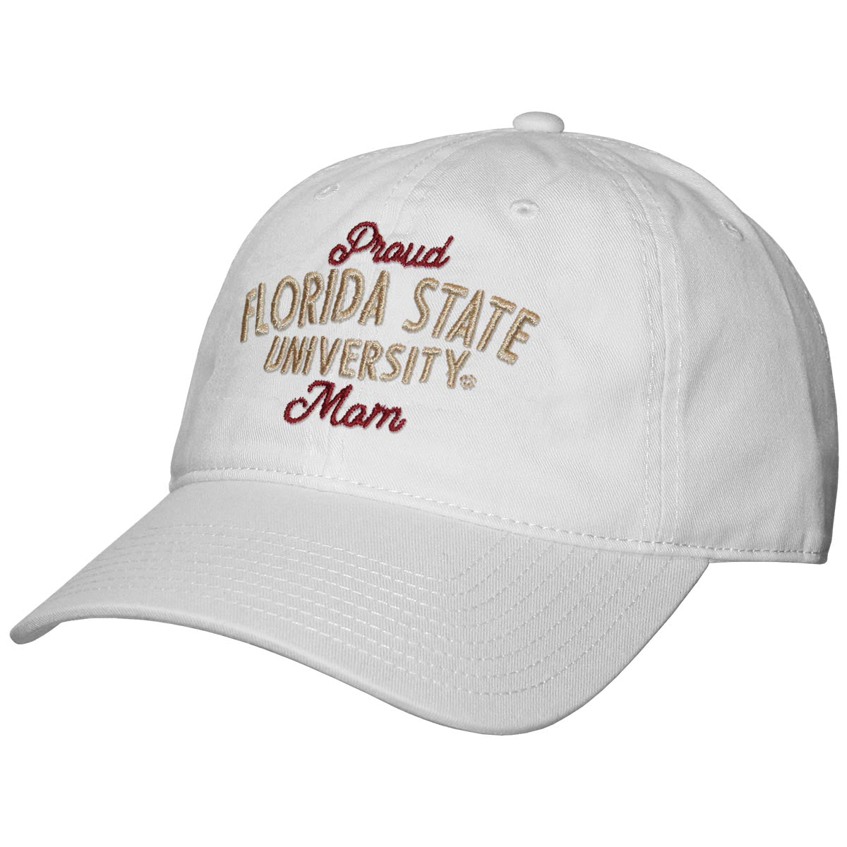 Material | 100% Cotton. Color | White. Women's adjustable garment washed hat with embroidered Proud Florida State University Mom design.
