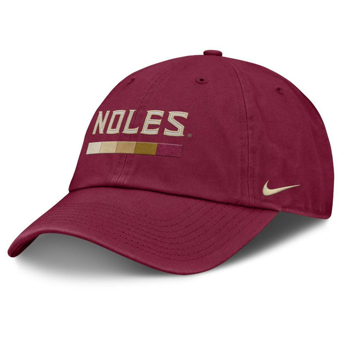Material | 100% Cotton. Color | Garnet. Nike men's adjustable club campus unstructured hat with embroidered Noles.