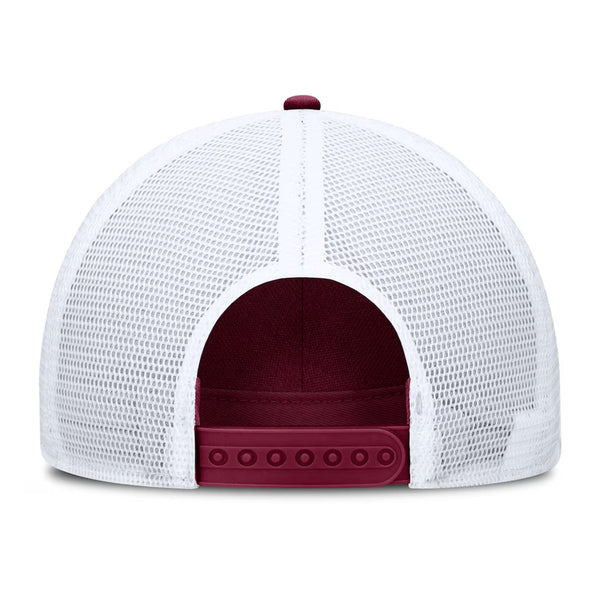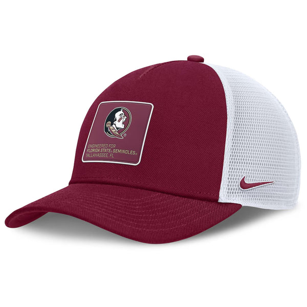 Material | Cotton/Polyester. Color | Garnet/White. Nike men's Rise Gameday 5-panel structured adjustab;e trucker hat with rubberized Seminole Head patch.