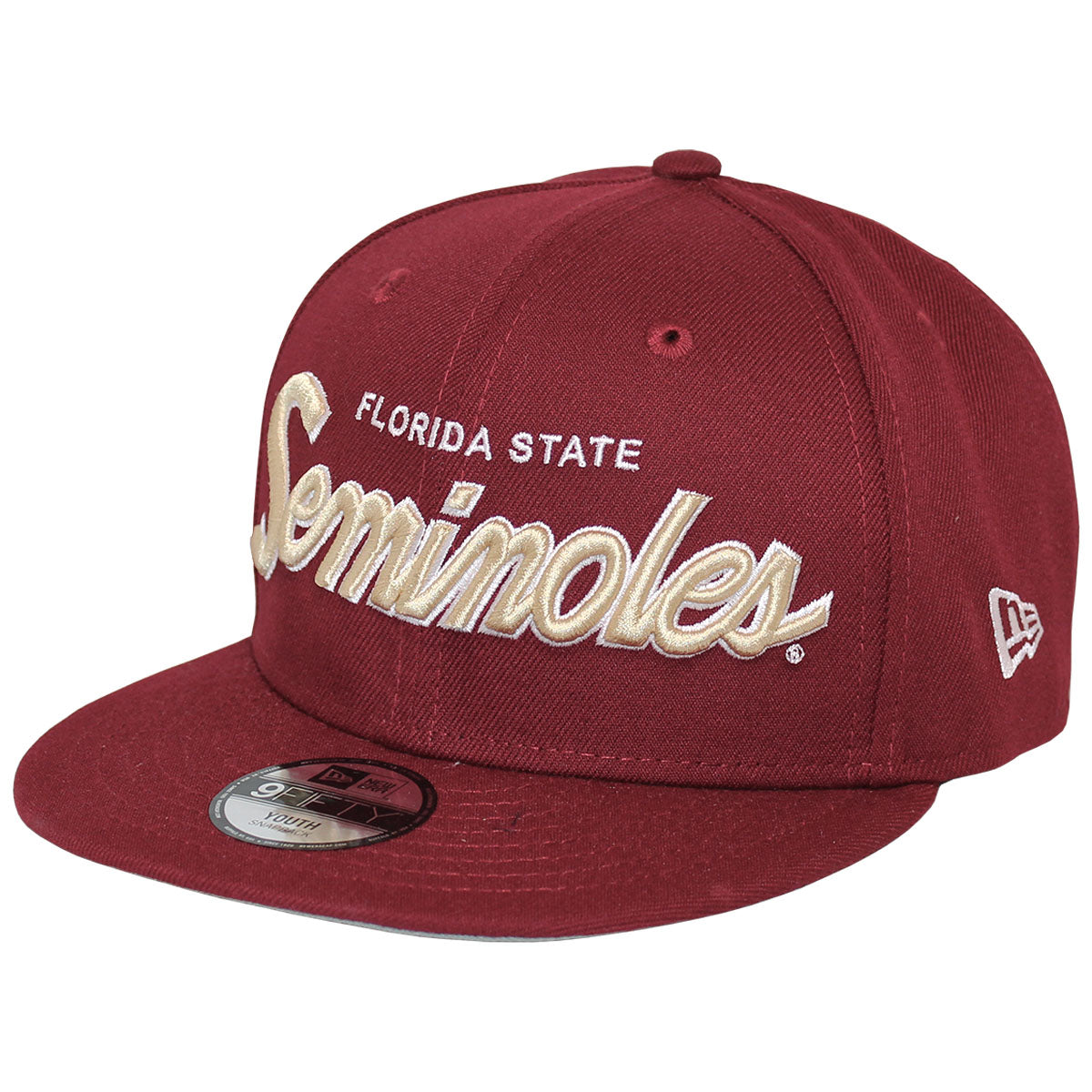Material | 100% Polyester. Color | Garnet. New Era youth flat bill snapback cap with 3D embroidered Florida State Seminoles. Embroidered Seminole Head on side.