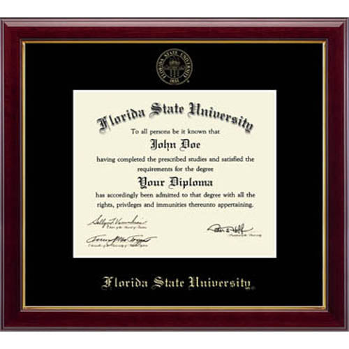 This Florida State diploma frame boasts museum-quality black matting with your Florida State logo and wordmarks ornately embossed in gold.