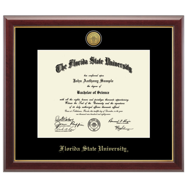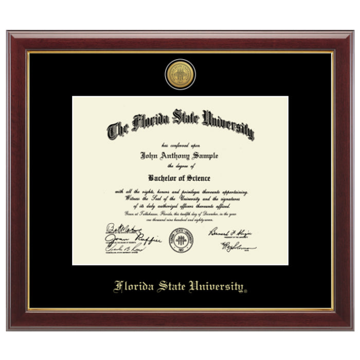 Design features gold engraved seal medallion set into a 23K bezel recessed into black museum-quality matting with Florida State University embossed in gold below.Framed in Gallery moulding crafted of solid hardwood with a high gloss cherry lacquer and a gold inner lip. Width 1.75"