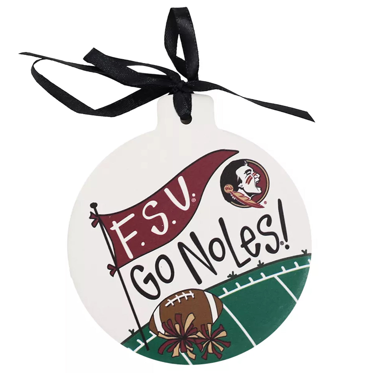 Round stone ornament with FSU Go Noles Seminole Head Football Design.
