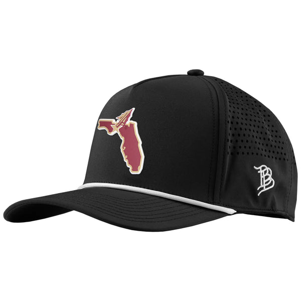 Material | 97% Polyester, 3% Spandex. Color | Black. Men's adjustable curved 5-panel rope hat with PVC State of Florida Arrowhead patch. High Crown. Moisture wicking. Water repellent. UPF 50+ protection.