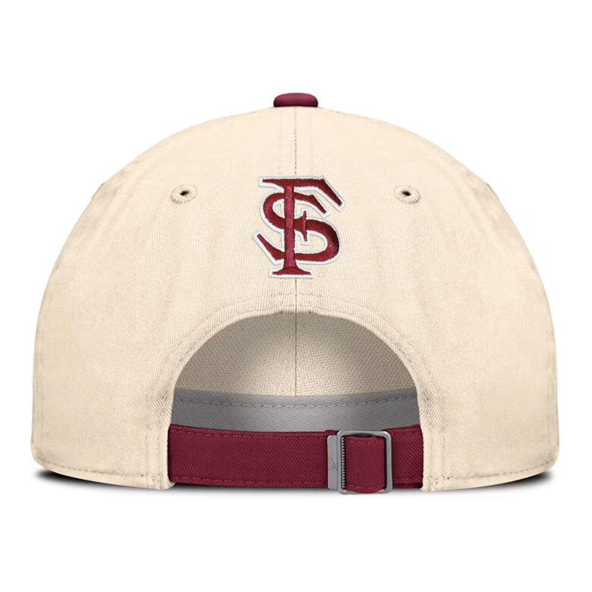 Material | 100% Cotton. Color | Natural/Garnet. Nike men's adjustable Club Primetime unstructured, low profile hat with embroidered Florida State Seminole Head. Embroidered Interlock FS on back.