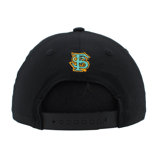 Adjustable black snap back cap features teal and orange embroidered Seminoles design at center front and Interlocking FS at back. 100% Cotton.