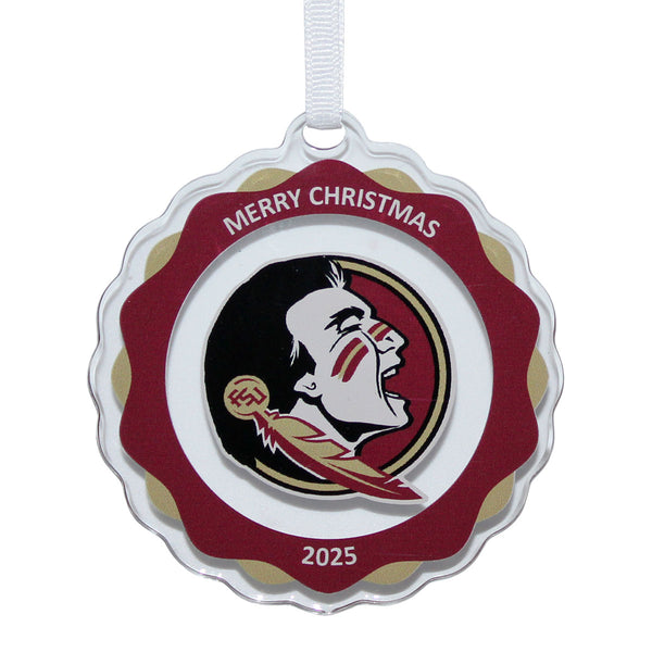 Acrylic Seminole Head Merry Christmas 2025 ornament.