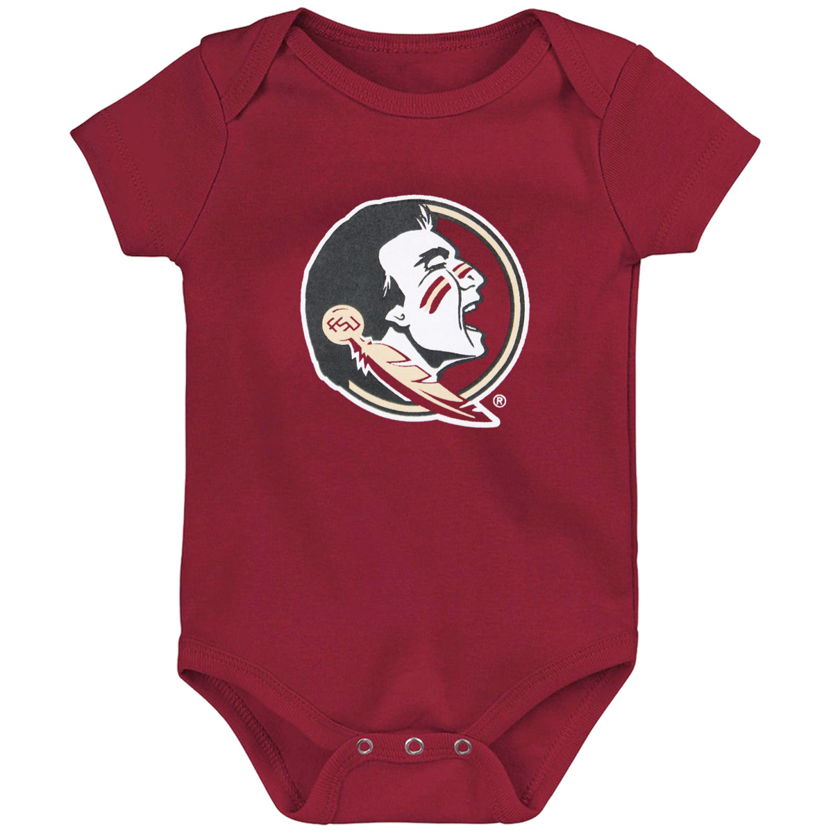 Material | 60% Cotton, 40% Polyester. Color | Garnet. Infant onesie with screen printed Seminole Head.