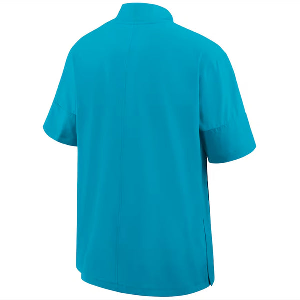 Material | 86% Polyester, 14% Elastane. Color | Turquoise. Nike men's lightweight short sleeve coach's jacket with rubberized Seminole Head patch. Zippered pockets. Zippered sides.