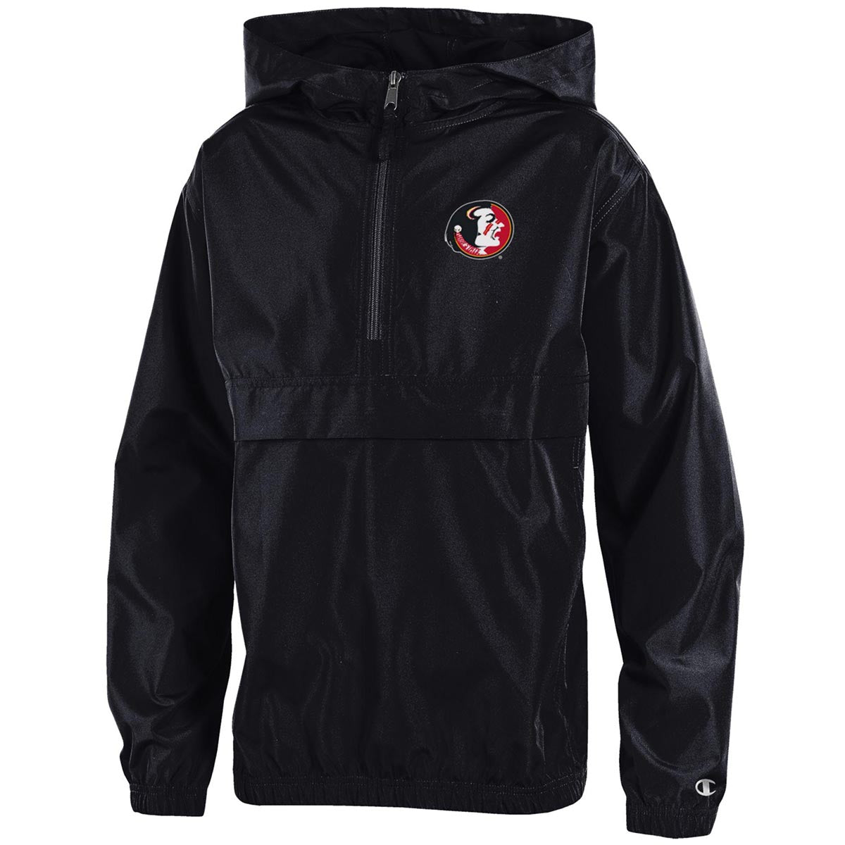 Material | 100% Polyester. Color | Black. Champion youth packable jacket with screen printed Vault Seminole Head. Zippered front pocket.