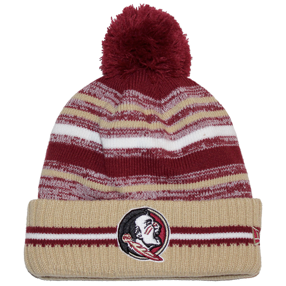 New Era Seminole Logo Striped Fleece Lined Pom Knit Cap - Garnet/Gold - GAR/GOLD/WH is backordered and will ship as soon as it is back in stock.
