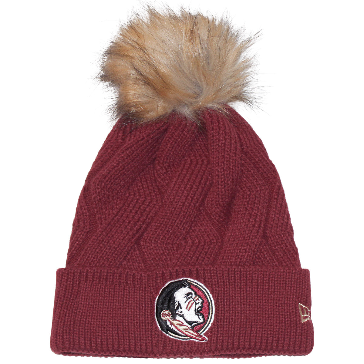 New Era Women's Seminole Logo Faux Fur Pom Cable Knit Cap - Garnet - Garnet is backordered and will ship as soon as it is back in stock.