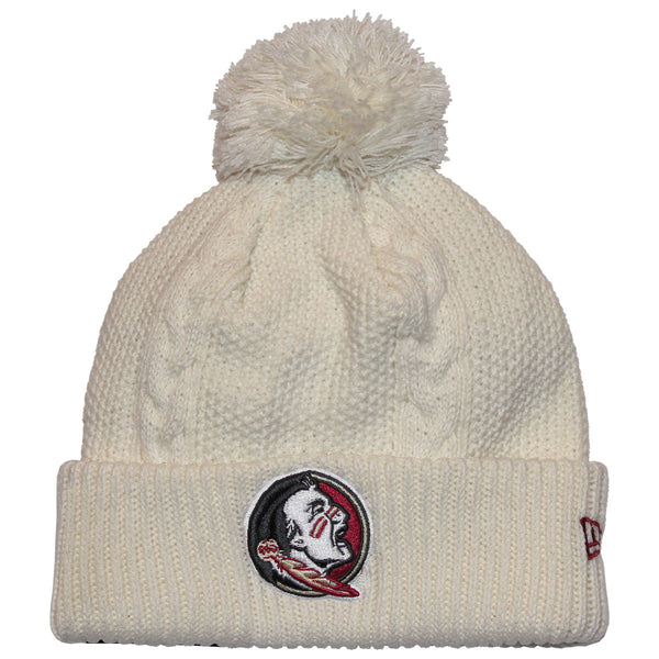 Material | 100% Acrylic. Color | Off White. New Era women's knit pom cuffed cableknit beanie with 3D embroidered Seminole Head.