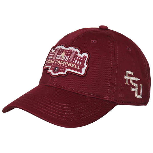 Material | 100% Cotton. Color | Garnet. Men's adjustable, low profile, twill hat with screen printed Doak Campbell Stadium printed patch. 3D embroidered Stacked FSU on side.