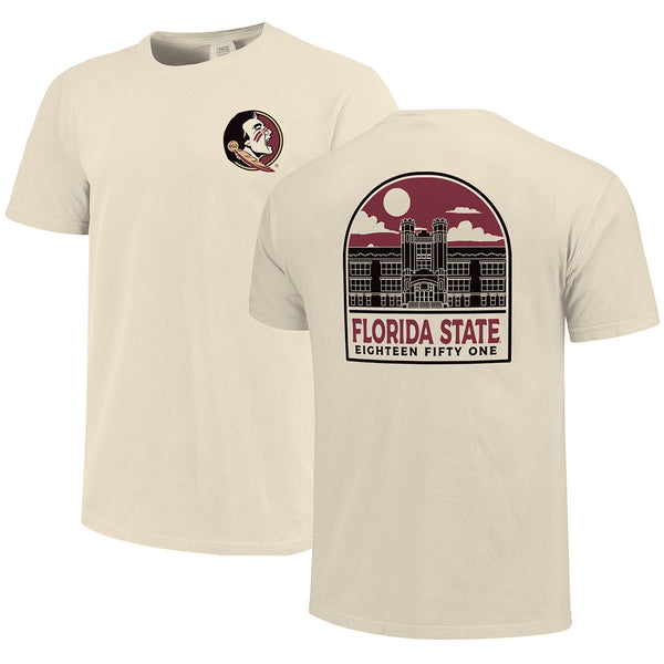 Material | 100% Cotton. Color | Bone. Men's short sleeve t-shirt with screen printed Seminole Head left chest. Screen printed Westcott Florida State design full back.