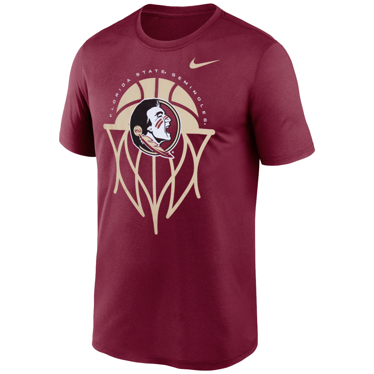 Material | 100% Polyester. Color | Garnet. Nike men's short sleeve Legend performance t-shirt with screen printed Florida State Seminoles Seminole Head Basketball design.