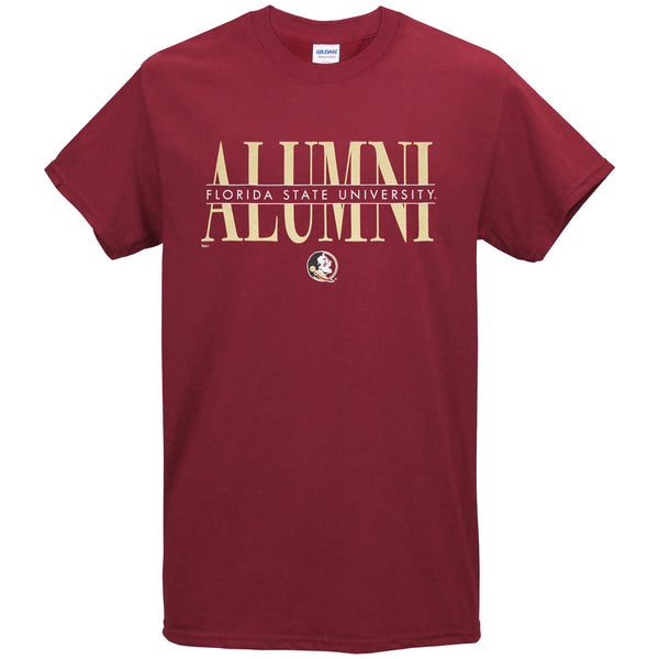Material | 100% Cotton. Color | Garnet. Adult/Unisex short sleeve t-shirt features screen printed Alumni Florida State University Seminole Head design.