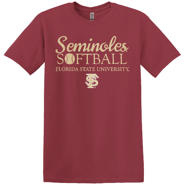 Material | 100% Cotton. Color | Garnet. Men's short sleeve t-shirt with screen printed Seminoles Softball Florida State University FS Design.