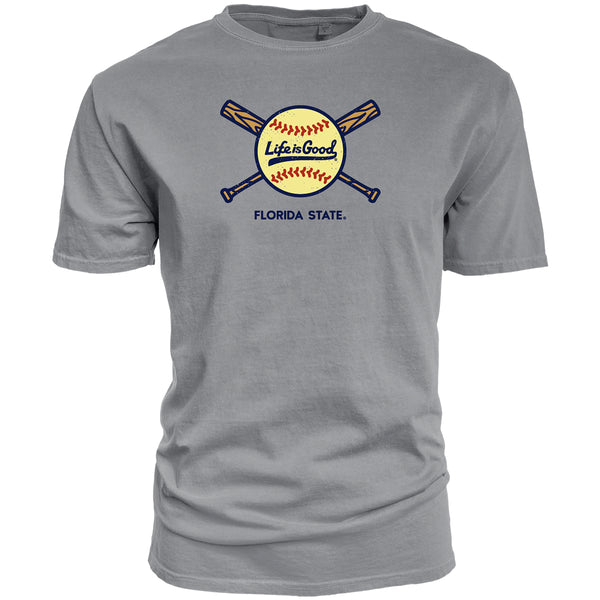Material | 100% Cotton. Color | Steel. Men's short sleeve t-shirt with screen printed Florida State Softball crossed bats Life is Good Design.