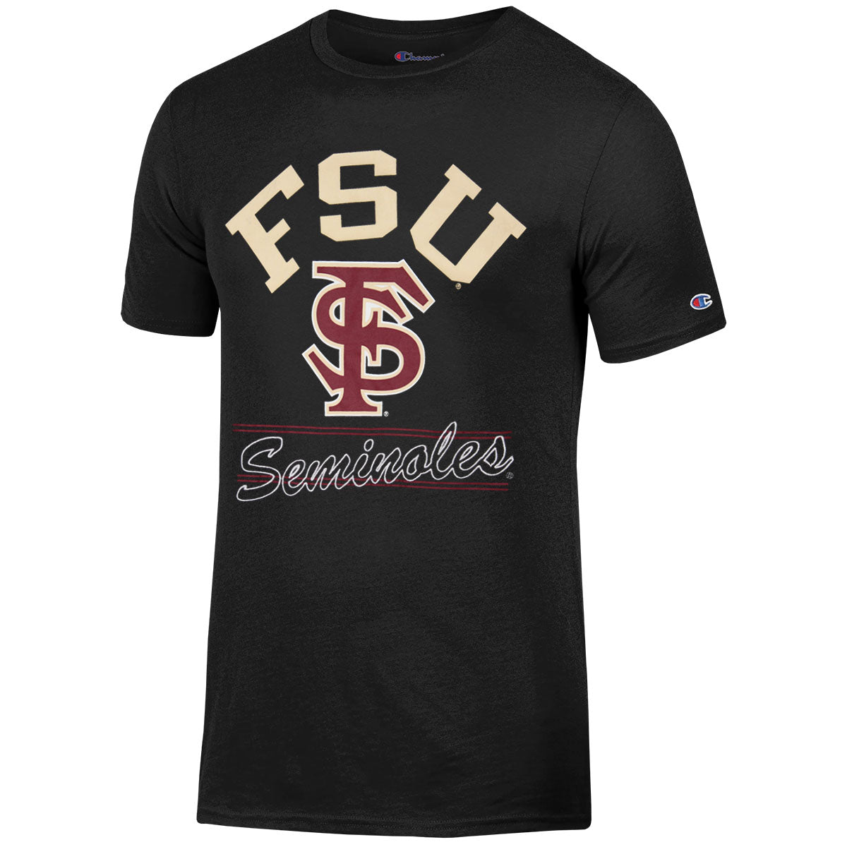 Material | 60% Cotton, 40% Polyester. Color | Black. Champion men's short sleeve t-shirt with screen printed FSU Interlock FS, embroidered Seminoles.