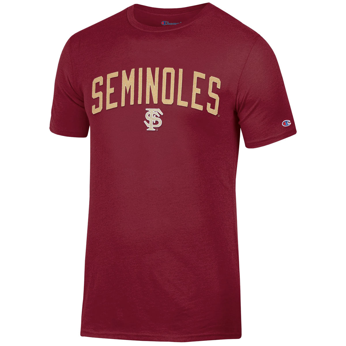 Material | 60% Cotton, 40% Polyester. Color | Garnet. Champion men's short sleeve t-shirt with embroidered applique Seminoles Interlock FS.