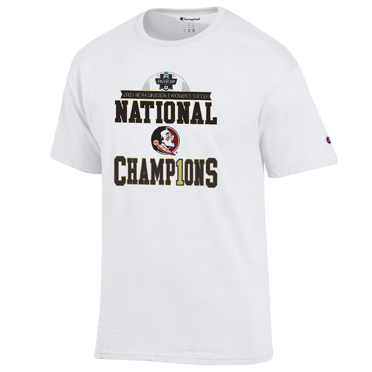 Material | 100% Cotton. Color | White. Champion unisex cut short sleeve tee features 2025 NCAA Women's Soccer National Champions Locker Room design.