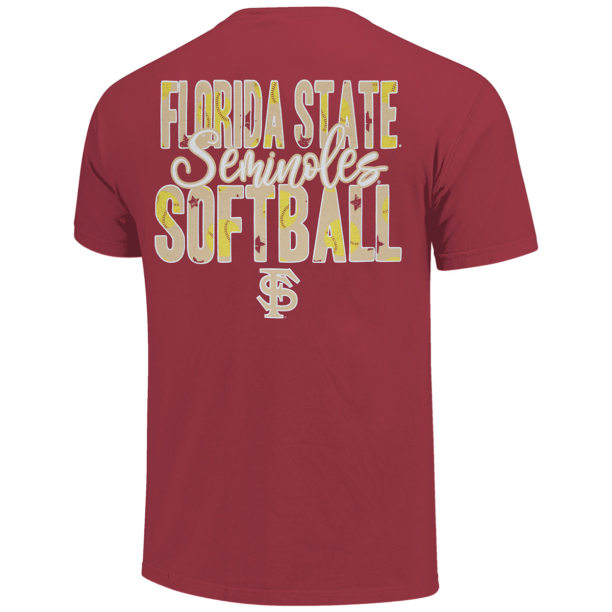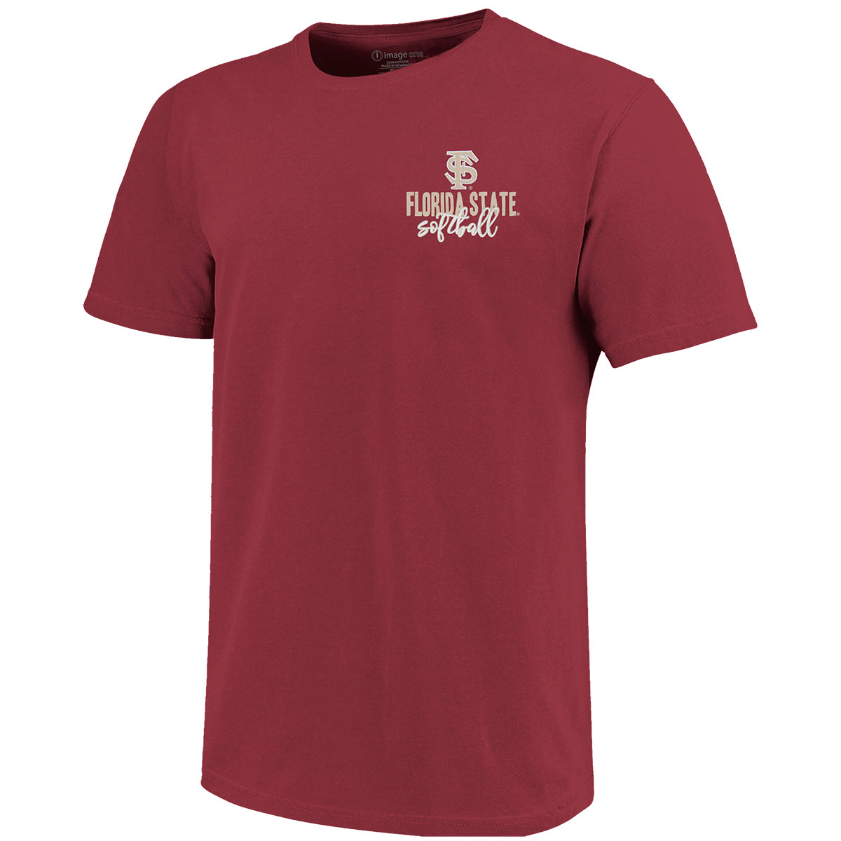 Material | 100% Cotton. Color | Garnet. Men's/Unisex short sleeve t-shirt with screen printed Interlock FS Florida State Softball left chest. Screen printed Florida State Seminoles Softball Interlock FS design full back.