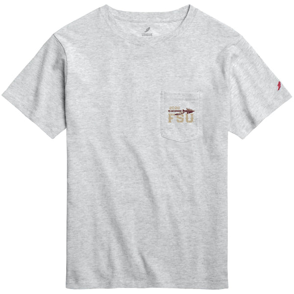 Material | 100% Cotton. Color | Ash. Men's short sleeve pocket t-shirt with distressed screen printed 2026 FSU Spear left chest. Distressed screen printed PBR design full back.