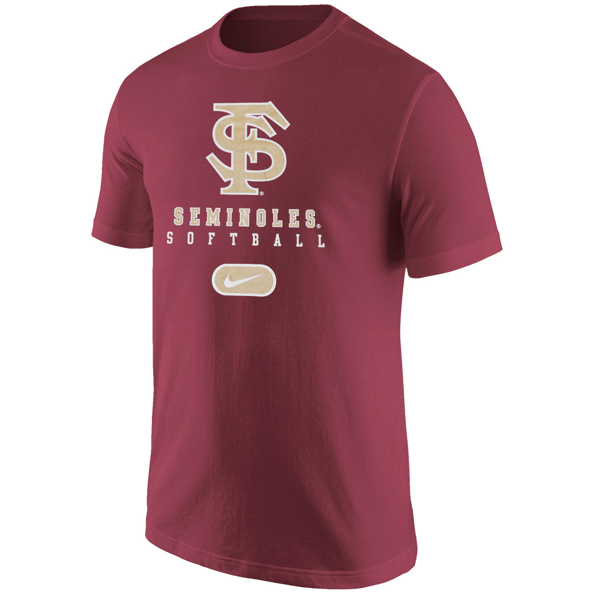 Material | 100% Cotton. Color | Garnet. Nike men's short sleeve t-shirt with screen printed FS Seminoles Softball design.