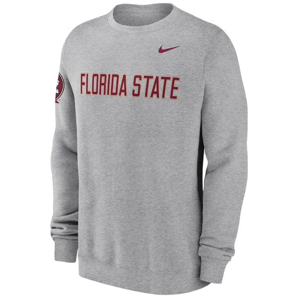 Material | 82% Cotton, 18% Polyester. Color | Dark Grey Heather. Nike men's club crew fleece with applique embroidered Florida State. Embroidered Seminole Head on sleeve.