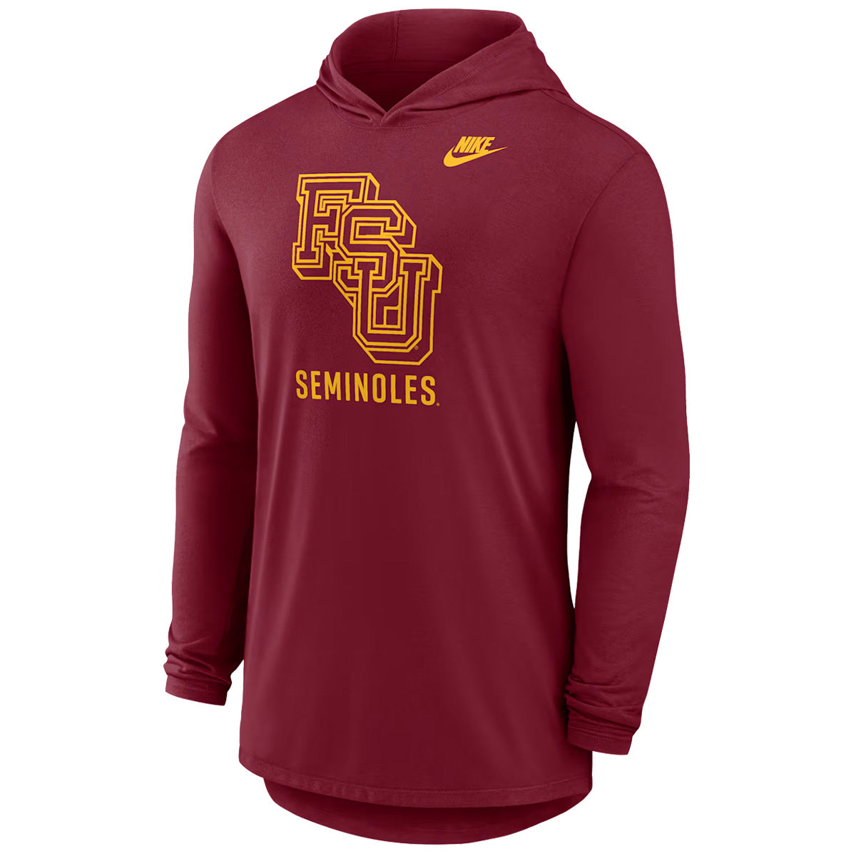 Material | 75% Polyester, 13% Cotton, 12% Rayon. Color | Crimson. Nike men's Legacy long sleeve hooded t-shirt with screen printed Vault Stacked FSU Seminoles design.
