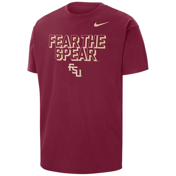Material | 100% Cotton. Color | Garnet. Nike men's short sleeve Max90 Trend t-shirt with screen printed Fear the Spear Stacked FSU design.