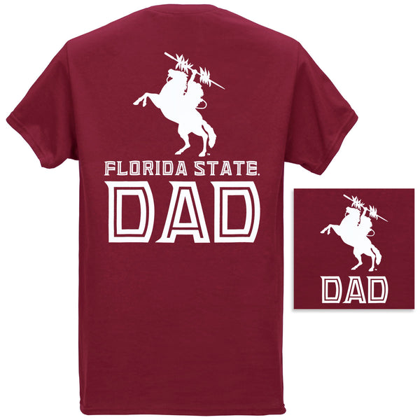 Material | 100% Cotton. Color | Garnet. Men's short sleeve t-shirt with screen printed Unconquered silhouette Dad left chest. Screen printed Unconquered silhouette Florida State Dad full back.