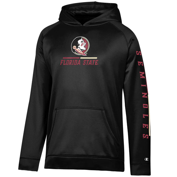 Material | 100% Polyester. Color | Black. Champion men's performance hood with screen printed Seminole Head Florida State. Screen printed Seminoles on sleeve. Pocket.