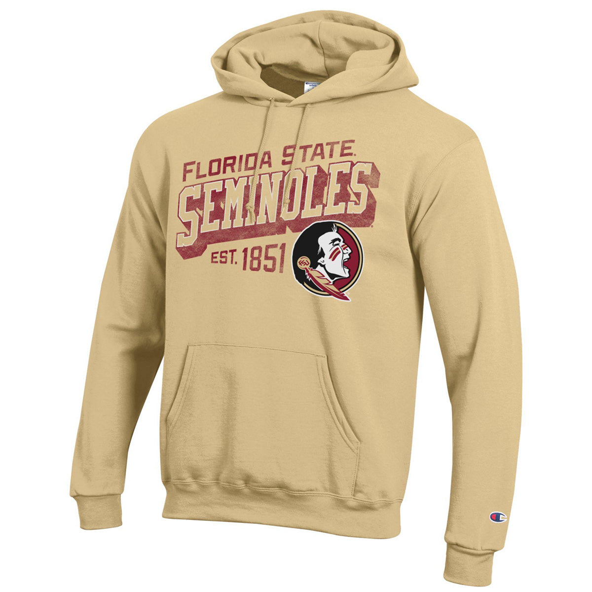 Material | 50% Cotton, 50% Polyester. Color | Vegas Gold. Champion men's powerblend hood with distressed screen printed Florida State Seminoles Seminole Head design. Pocket.