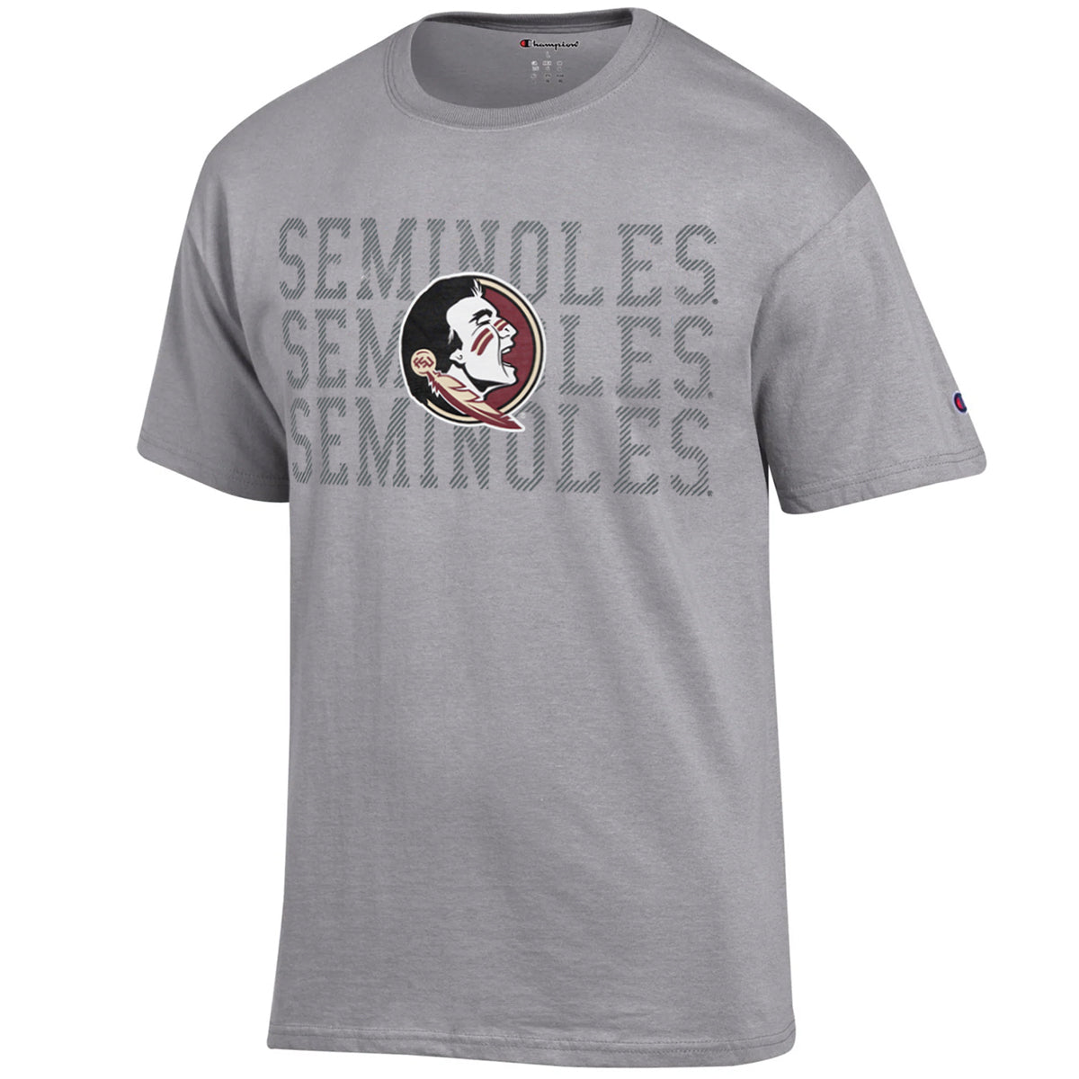 Material | 90% Cotton, 10% Viscose. Color | Steel. Champion men's soft, short sleeve t-shirt with screen printed Seminoles Seminole Head design.