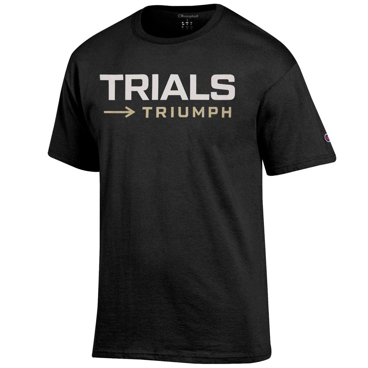 Material | 100% Cotton. Color | Black. Champion men's short sleeve t-shirt with screen printed Trials to Triumph Logo