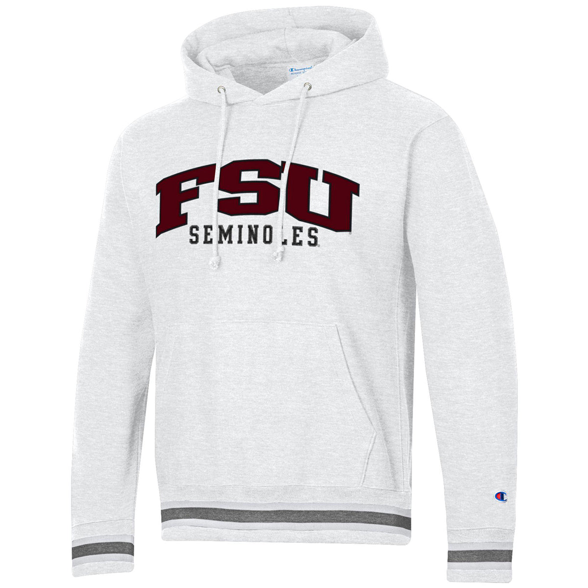 Material | 80% Cotton, 20% Polyester. Color | Silver Grey. Champion men's reverse weave hood with embroidered tackle twill FSU Seminoles. Pocket.