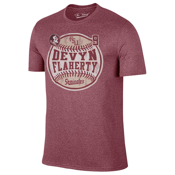 Material | 50% Polyester, 50% Cotton. Youth: 100% Cotton. Color | Garnet. Unisex/Youth short sleeve t-shirt with distressed screen printed Devyn Flaherty #9 Softball design. Please note: Adult sizes printed on heathered garnet tee (as shown), youth sizes are soild garnet.
