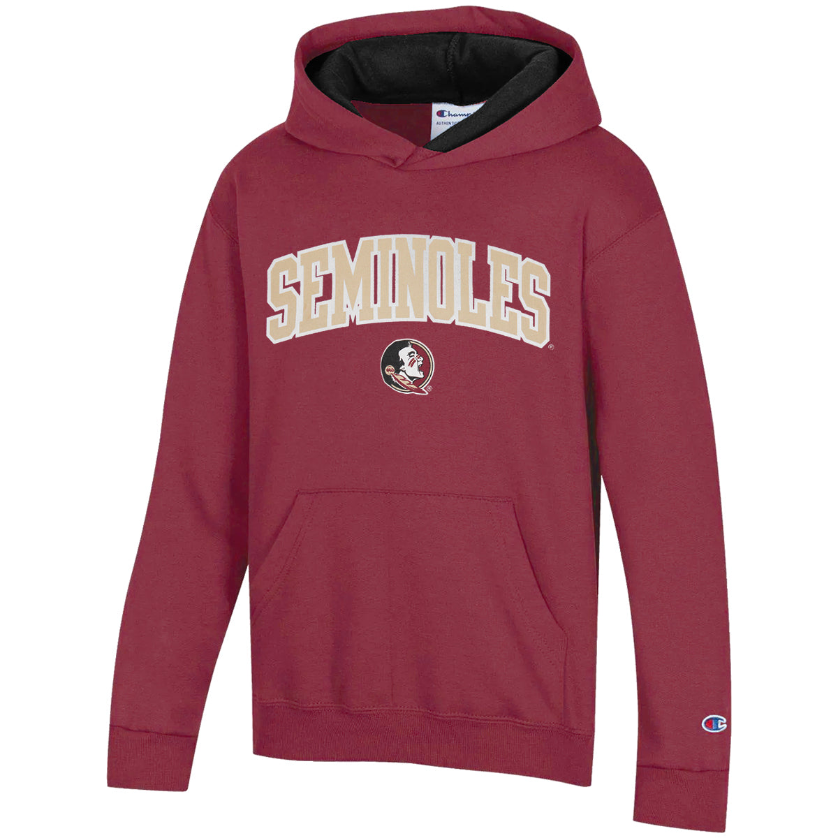 Material | 60% Cotton, 40% Polyester. Color | Garnet. Champion youth hood with screen printed Seminoles Seminole Head. Pocket.