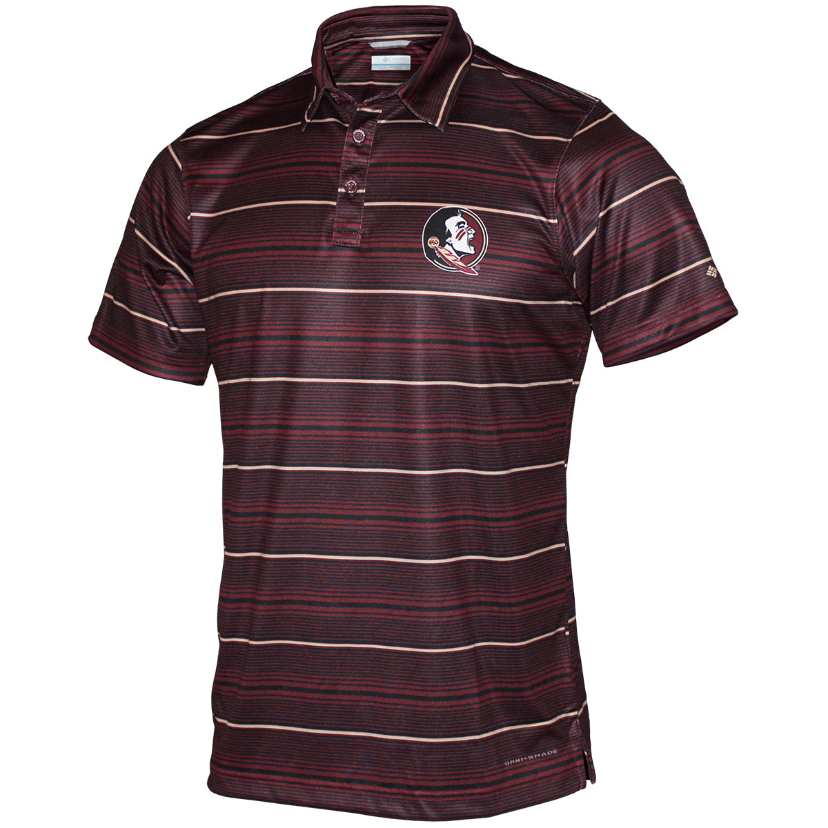 Material | 100% Polyester. Color | Garnet. Columbia men's sublimated Super Terminal Tackle polo with Seminole Head. Omni-Shade™ UPF 50 sun protection.