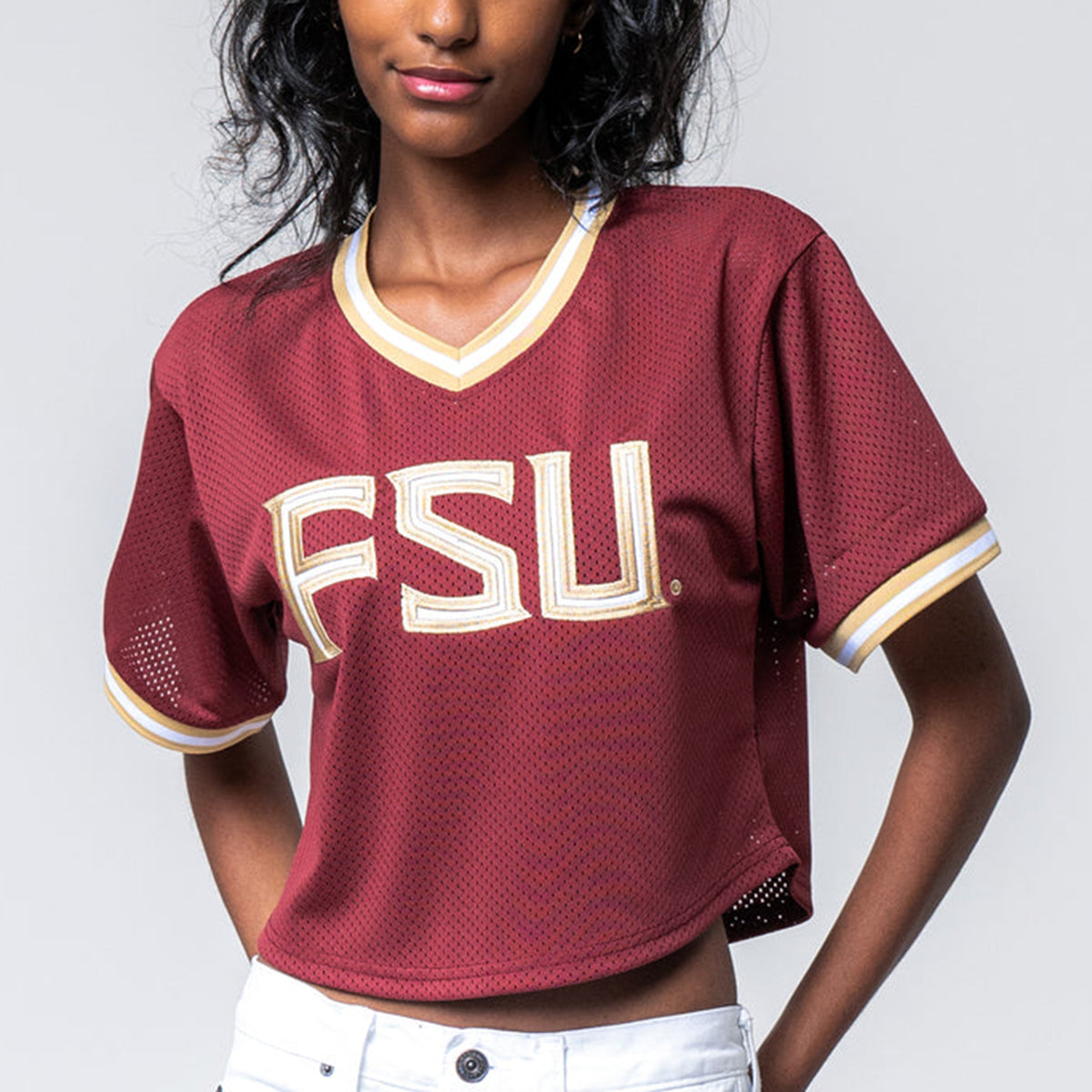 Material | 100% Polyester. Color | Garnet. Women's pullover crop jersey with applique embroidered FSU. Embroidered Seminole Head on sleeve.