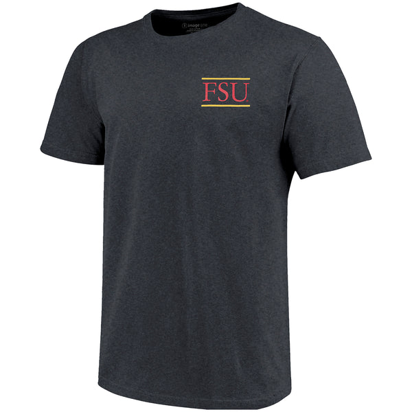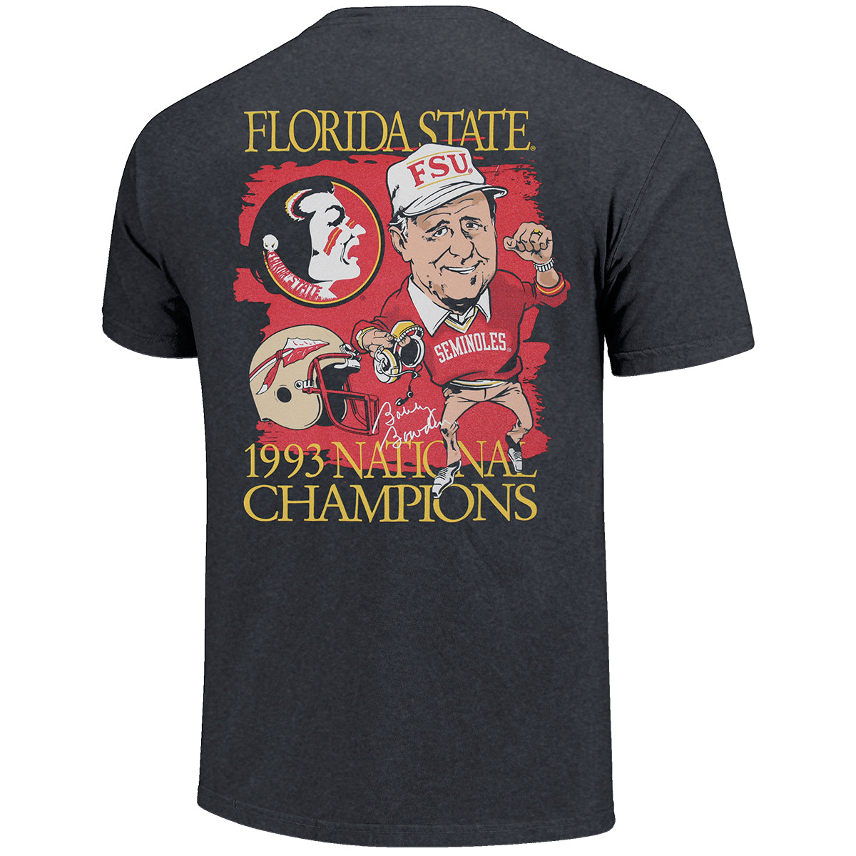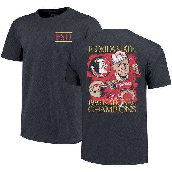 Material | 100% Cotton. Color | Graphite Heather. Men's short sleeve t-shirt with screen printed FSU front. Screen printed Vault Seminole Head Bobby Bowden 93 Champs design full back.