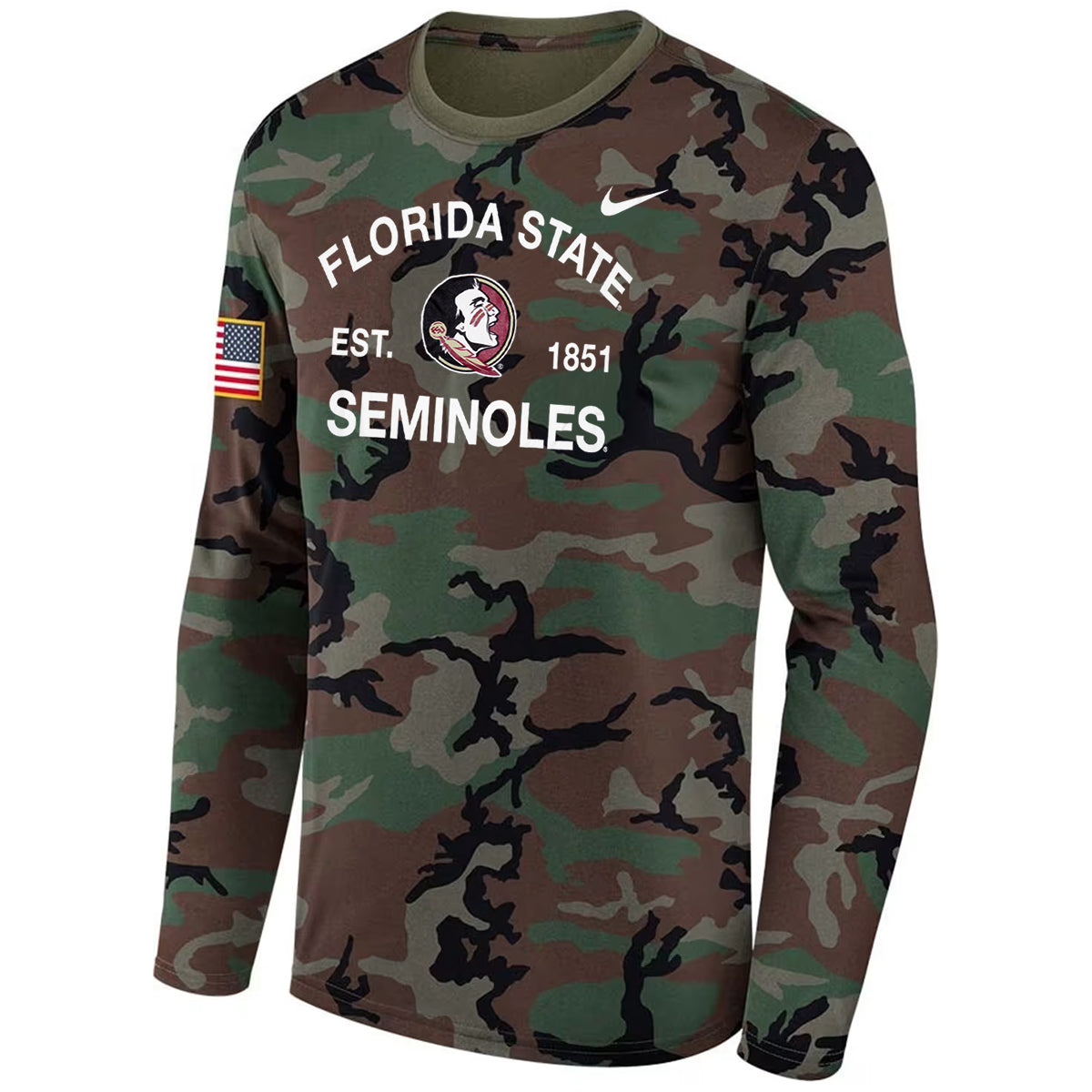 Material | 100% Polyester. Color | Camo. Nike men's dri-fit Legend long sleeve military t-shirt with screen printed Florida State Seminoles Seminole Head design.