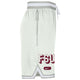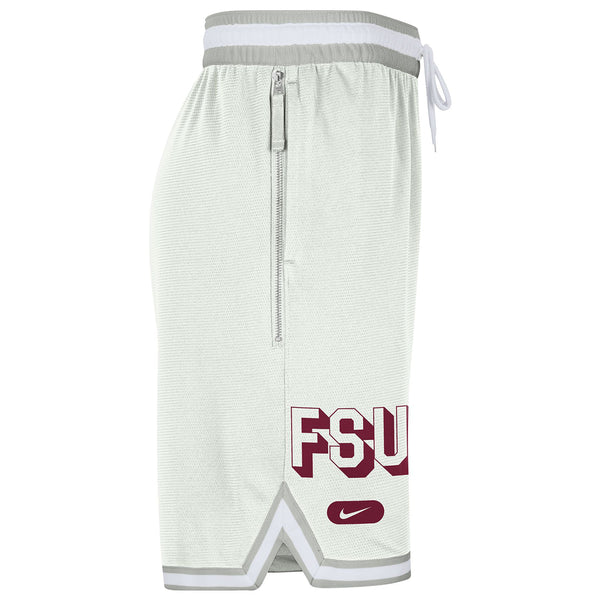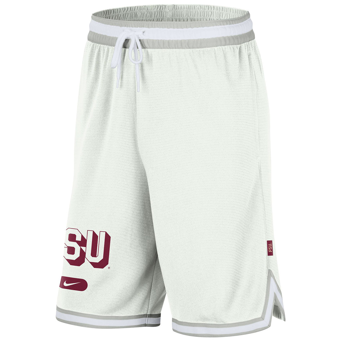 Material | 100% Polyester. Color | White. Nike men's dri-fit DNA short with screen printed FSU. Pockets. Zippered pocket on right. Drawstring.