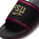 Cheer your team to victory in comfort with the Nike Offcourt (Florida State) Slide. A cushy synthetic leather strap features your team's logo, while an innovative foam midsole makes this slide so comfy, you'll never want to take it off. A contoured footbed cradles your foot while the dual-density foam adds cushioning and stability. The synthetic leather strap is lined with plush fabric that feels soft and comfortable.
