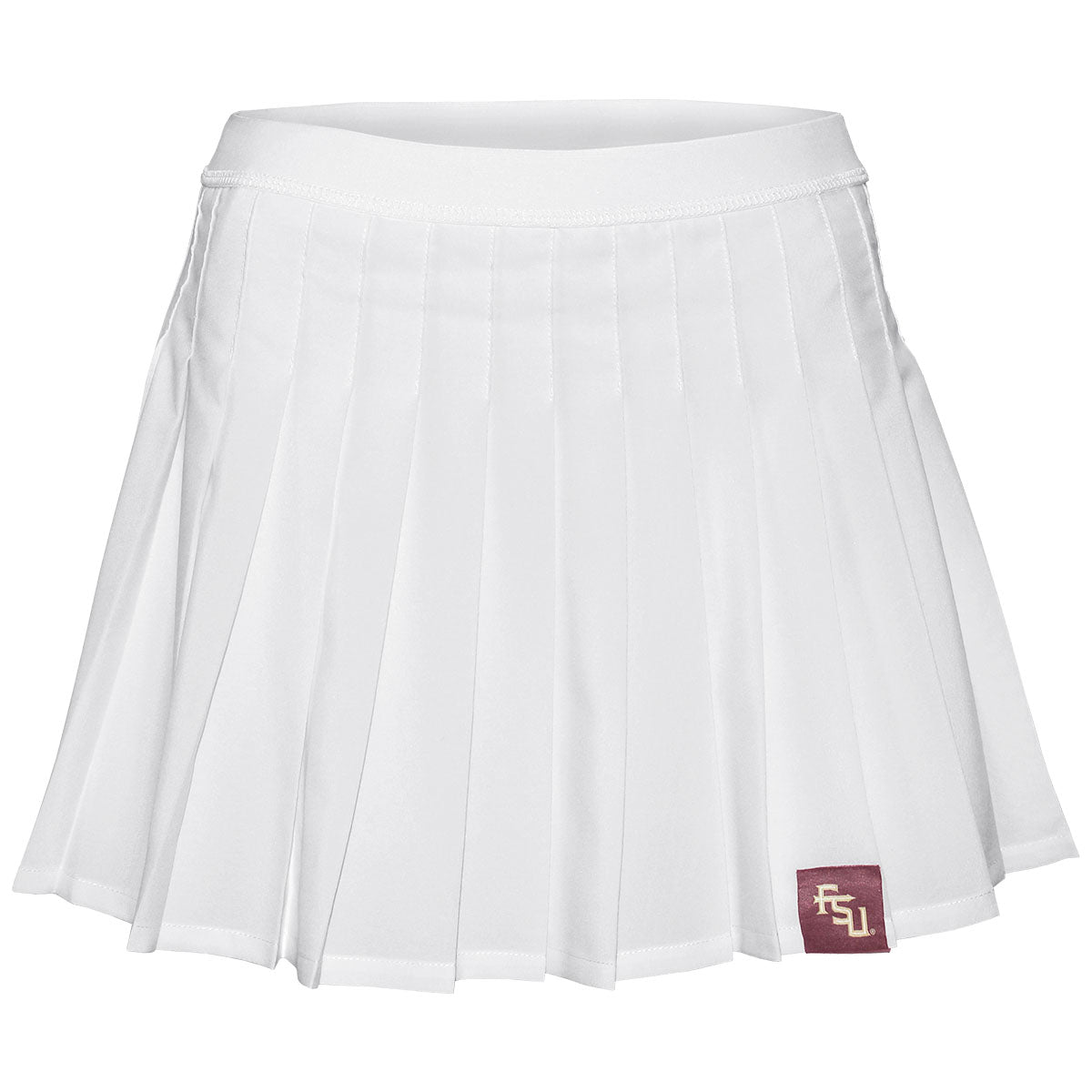 Material | 94% Polyester, 6% Spandex. Color | White. Women's pleated skort with embroidered Stacked FSU woven label.
