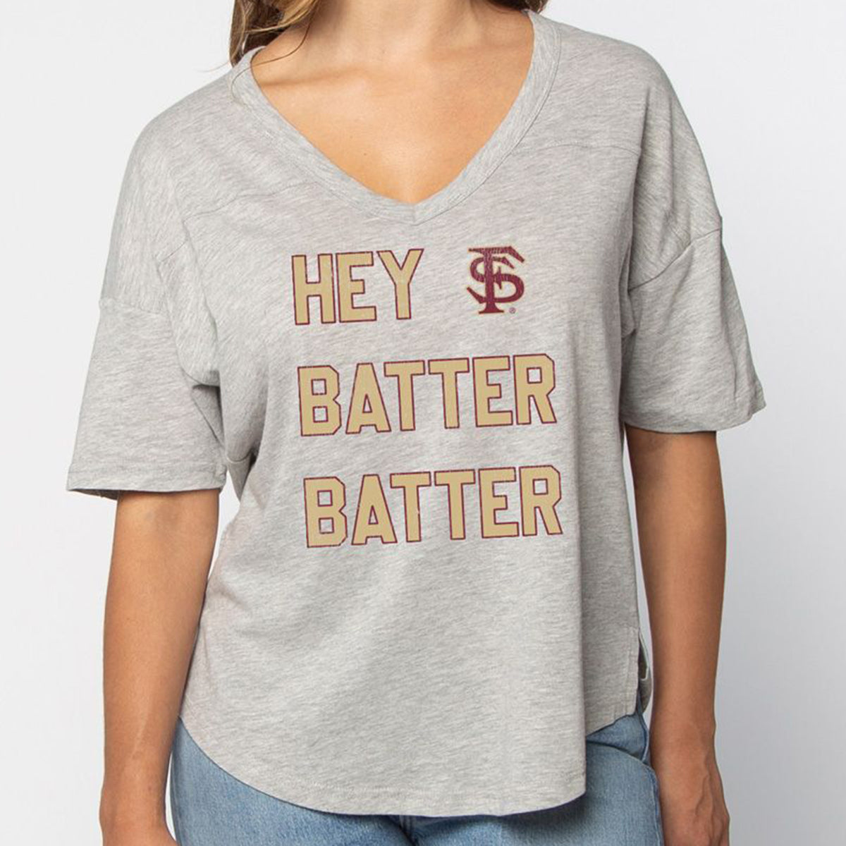 Material | 60% Cotton, 40% Polyester. Color | Heather Grey. Women's relaxed v-neck short sleeve t-shirt with distressed screen printed Interlock FS Hey Batter Batter design.