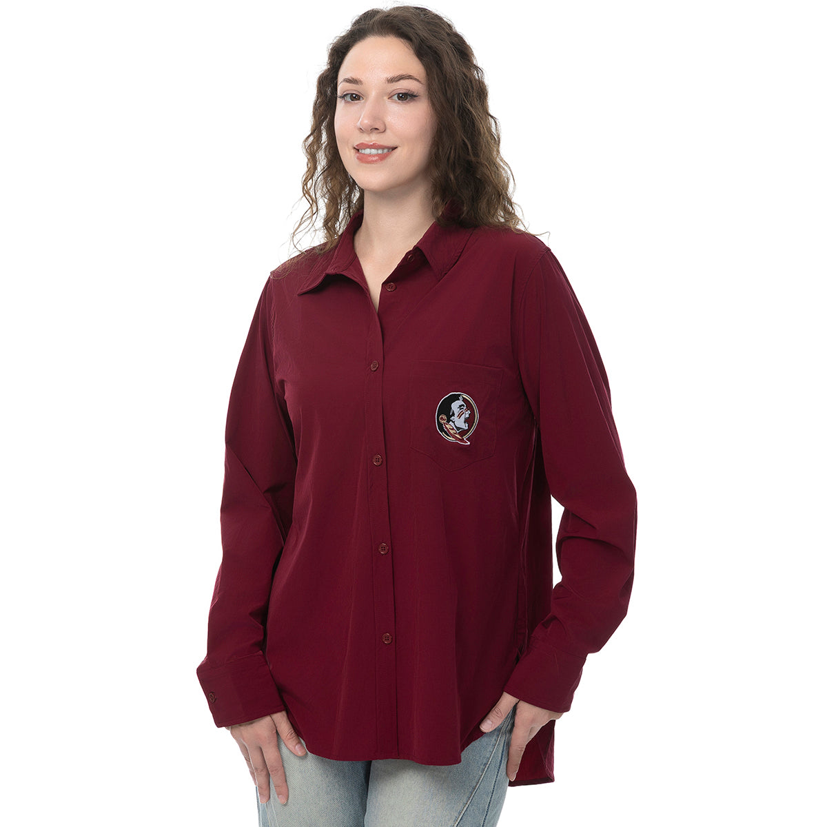 Material | 90% Nylon, 10% Spandex. Color | Garnet. Women's stretch woven button down top with embroidered Seminole Head.