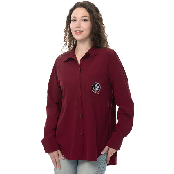 ZooZatz Women's Seminole Logo Stretch Woven Button Down Top - Garnet - Garnet / SM is backordered and will ship as soon as it is back in stock.